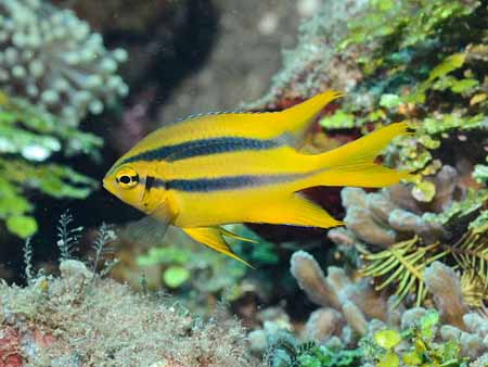 معرفی کرومیس دهان مشکی : این ماهی یک گونه بسیار فعال و زیبا، قبل از بلوغ است در این حالت با بدنی زرد و دو خط مشکی به راحتی قابل تشخیص است.