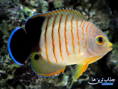 معرفی فرشته ماهی ایبلی : این فرشته ماهی با نوارهای نارنجی قرمز و دم مشکی و نوار آبی که در اطراف ناحیه پشتی بدن آن کشیده شده است بسیار زیبا می باشد.